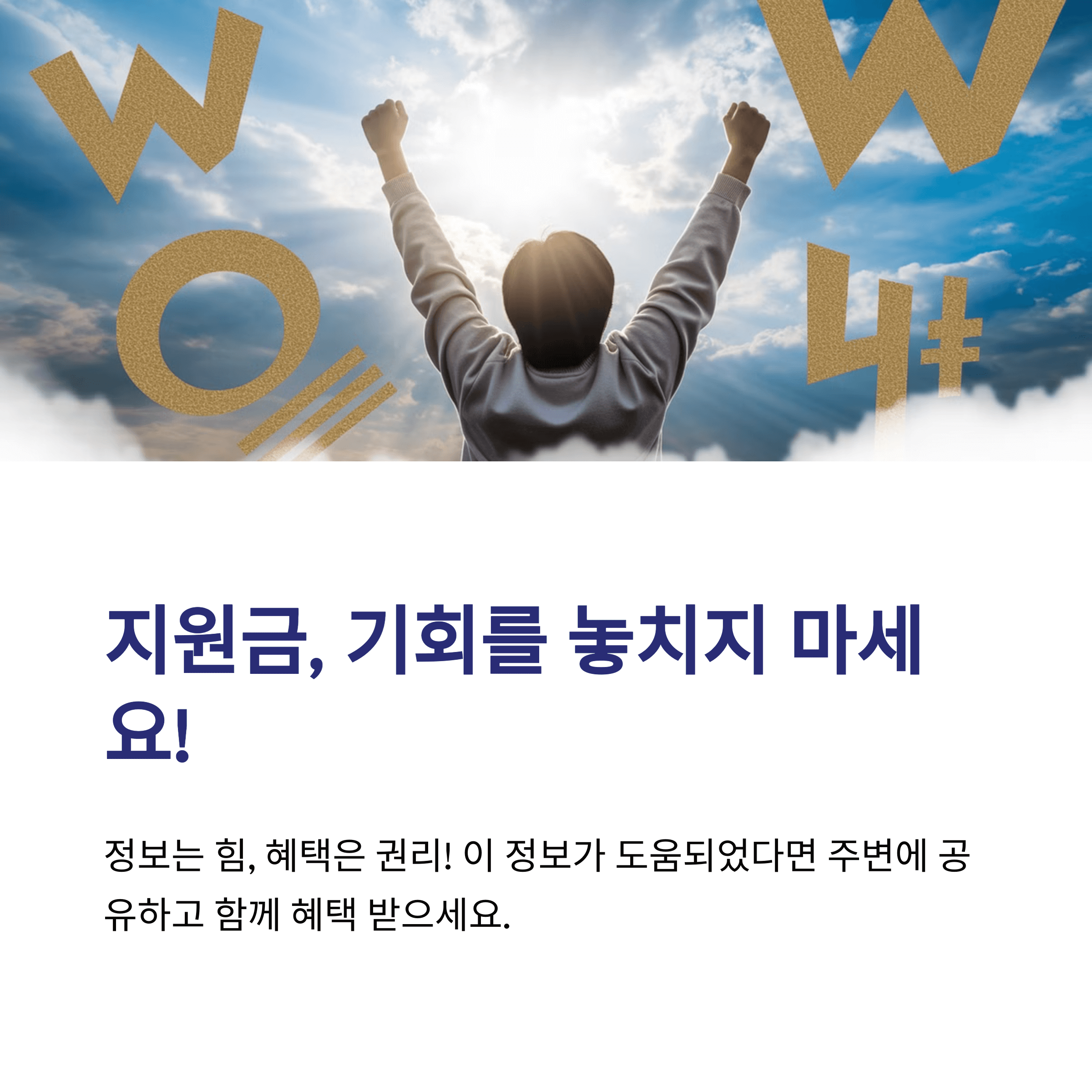 정부 지원금은 ‘정보력 싸움’이라고 해도 과언이 아니쥬. 누가 더 잘 알아보고 빨리 신청하느냐에 따라 받고 못 받고가 갈리니까요. 진짜 가끔은 100명 신청 중 1명만 받는 것도 있어서 타이밍 싸움도 중요하구요. 그러니까 미리미리 챙겨두고, 망설이지 말고 한 번쯤 신청해보시는 걸 강력 추천합니다!